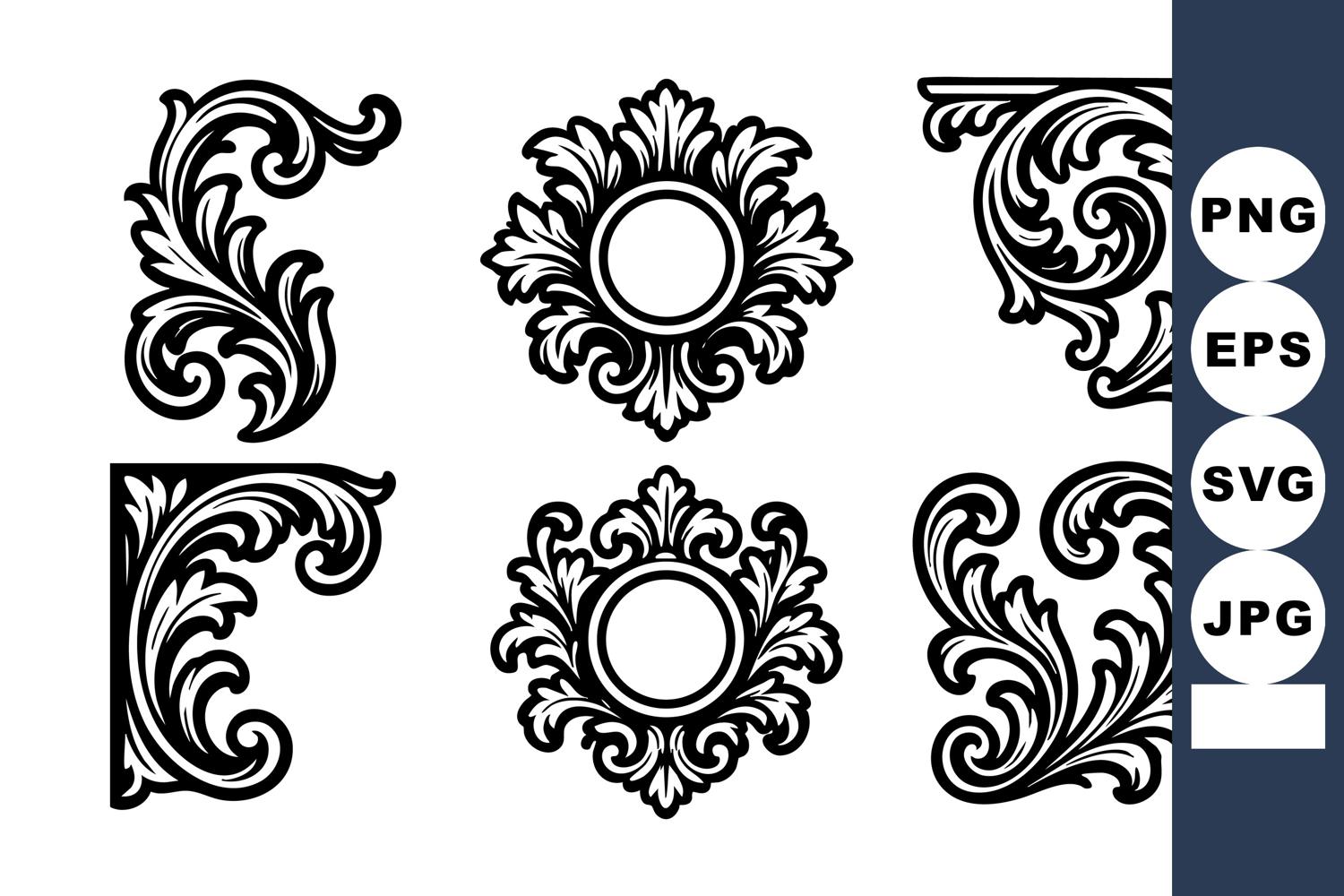 Vector features classic vintage floral ornaments with corner and round frame designs, perfect for elegant decoration and artistic embellishment, presenting a timeless and refined style.