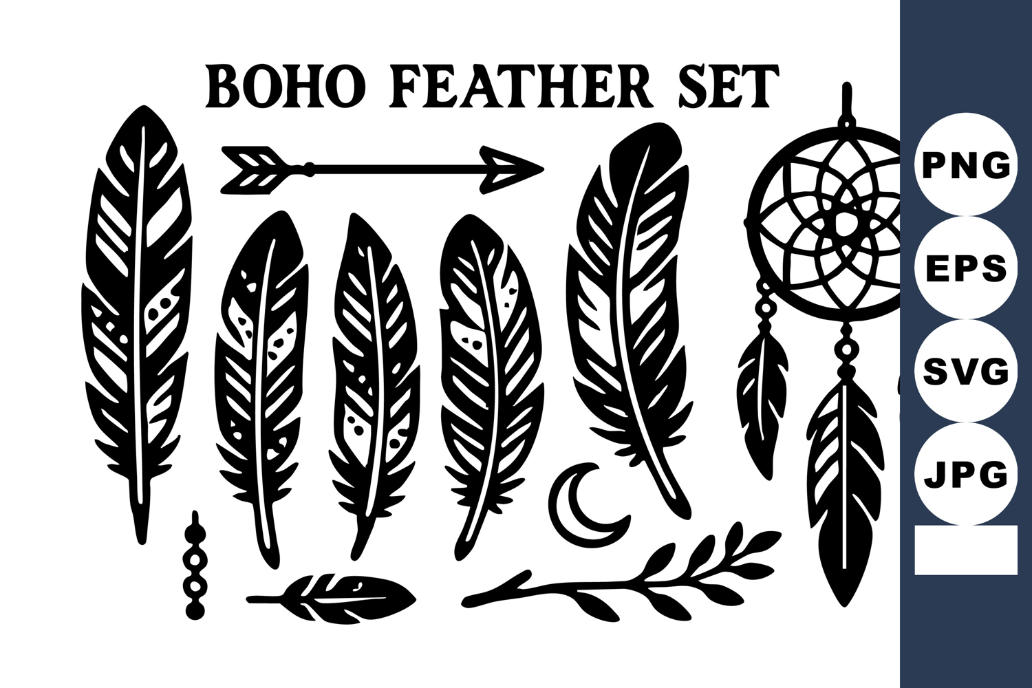 This vector features a boho feather with arrow, dreamcatcher, moon, and branch in black silhouette style, perfect for creative and artistic designs, elegant and mystical.