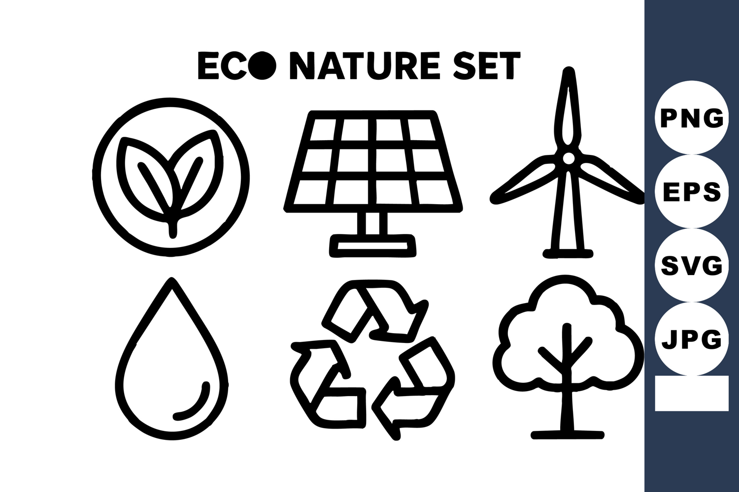 This vector features eco nature icons including solar panel, wind turbine, water drop, recycling symbol, tree, and leaf representing renewable energy and sustainability in a clean design. Calm and positive mood.