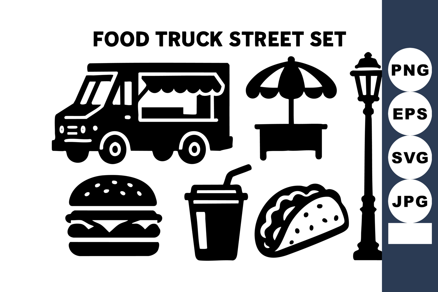 Vector icons showing a food truck, burger, taco, drink, umbrella stand, and street lamp in black silhouette style, perfect for urban food and street market themes, clear and simple mood.