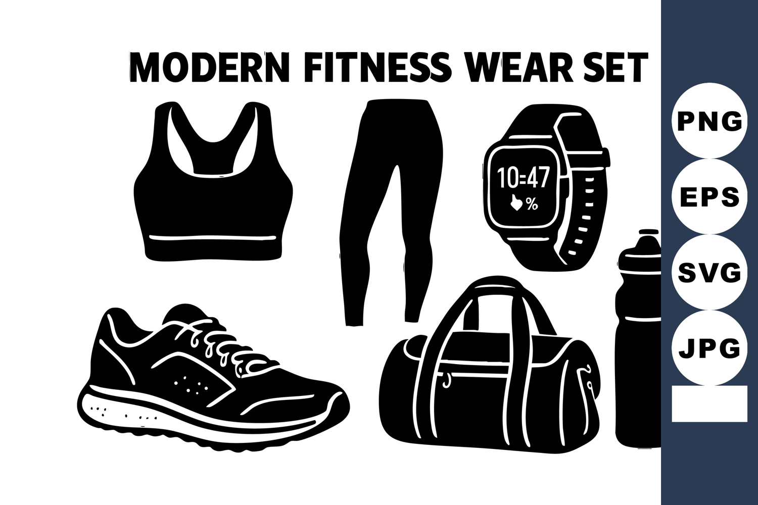 This vector features a modern fitness wear with essential workout items including a sports bra, leggings, running shoes, duffel bag, water bottle, and smartwatch for fitness enthusiasts. Energetic.