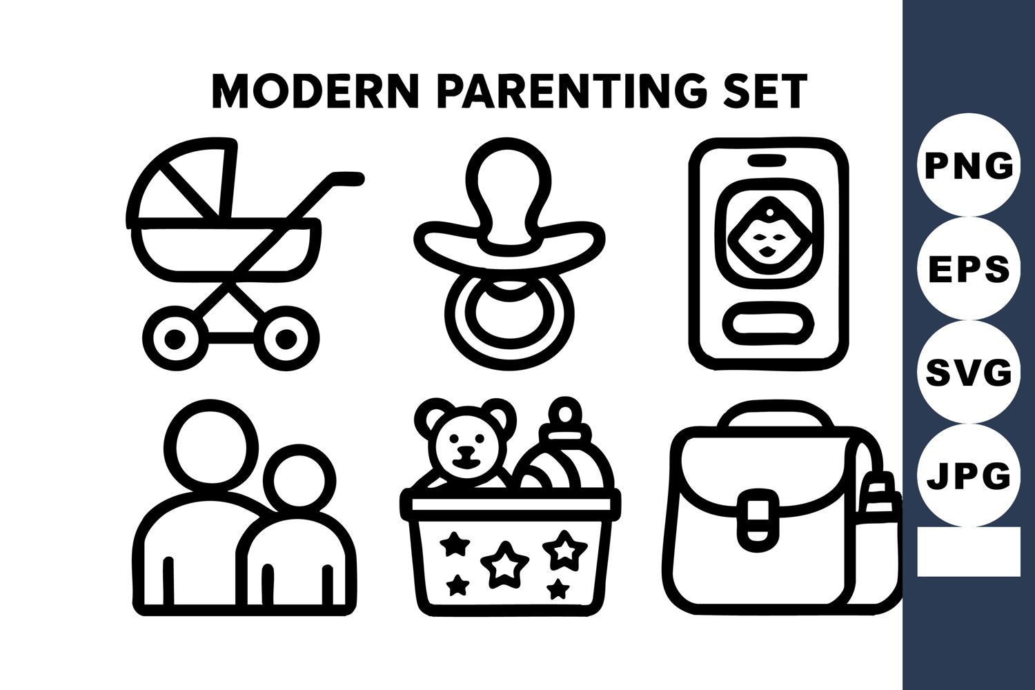 Vector icons shows modern parenting essentials including stroller, pacifier, parents, toy basket, and baby monitor in simple black line style, clear and practical design, friendly mood.