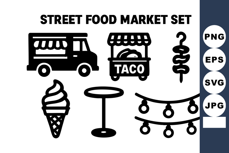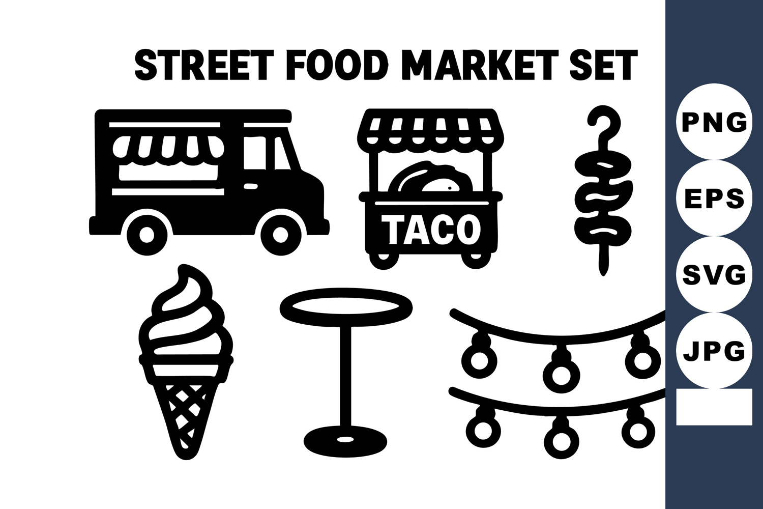 Vector icons depicting street food market elements including a food truck, taco cart, skewer, ice cream cone, table, and hanging lights in black silhouette style. Clear and simple design with urban theme. Friendly mood.