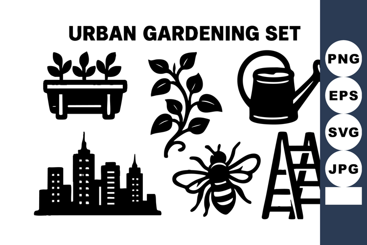 This vector graphic presents urban gardening elements including city buildings, growing plants, a bee, watering can, and ladder in black silhouette style. Creative and practical.