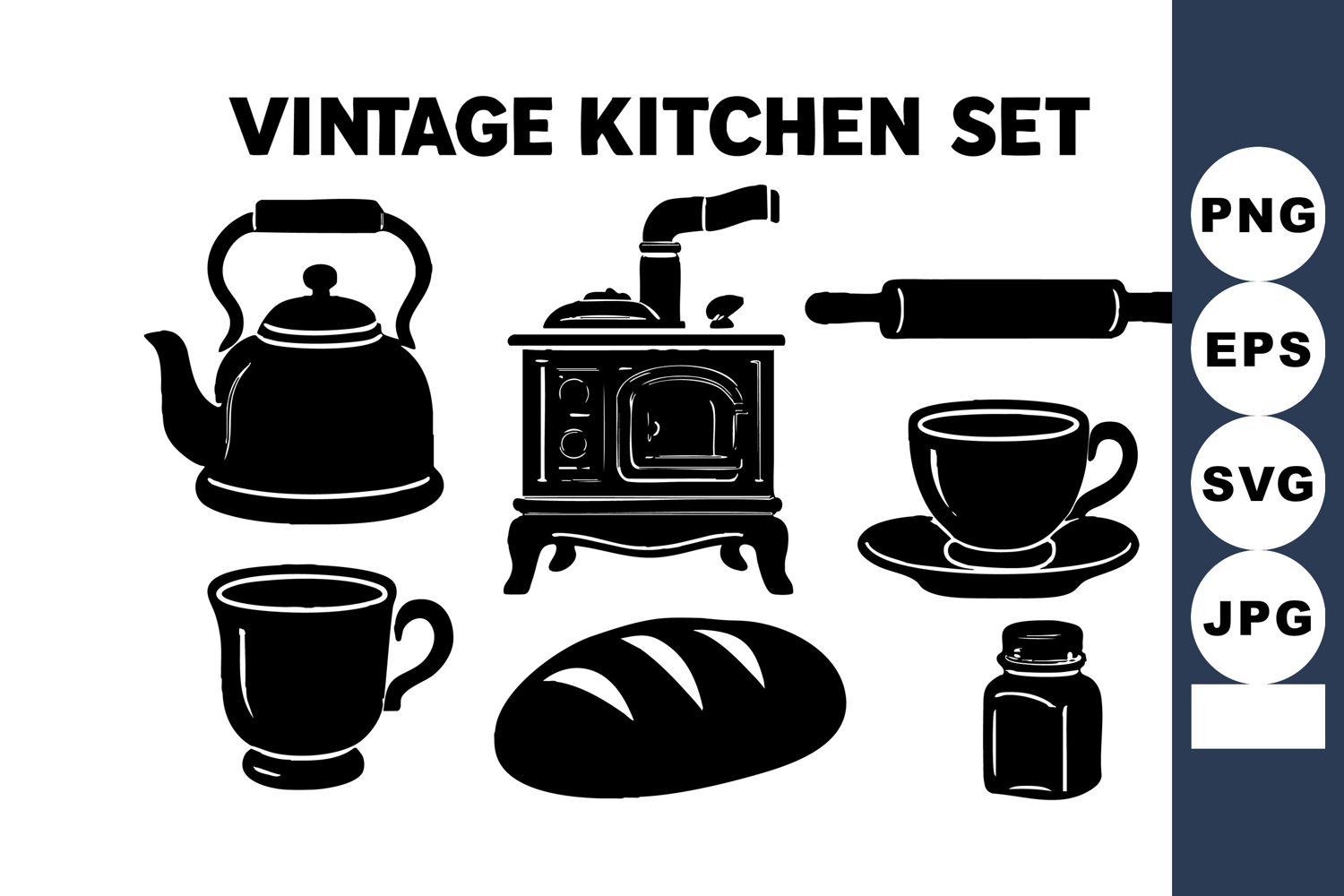 This vector illustration presents a vintage kitchen including kettle, stove, cups, bread, and spice bottle in black silhouette style. Classic and nostalgic kitchen theme. Timeless and charming.