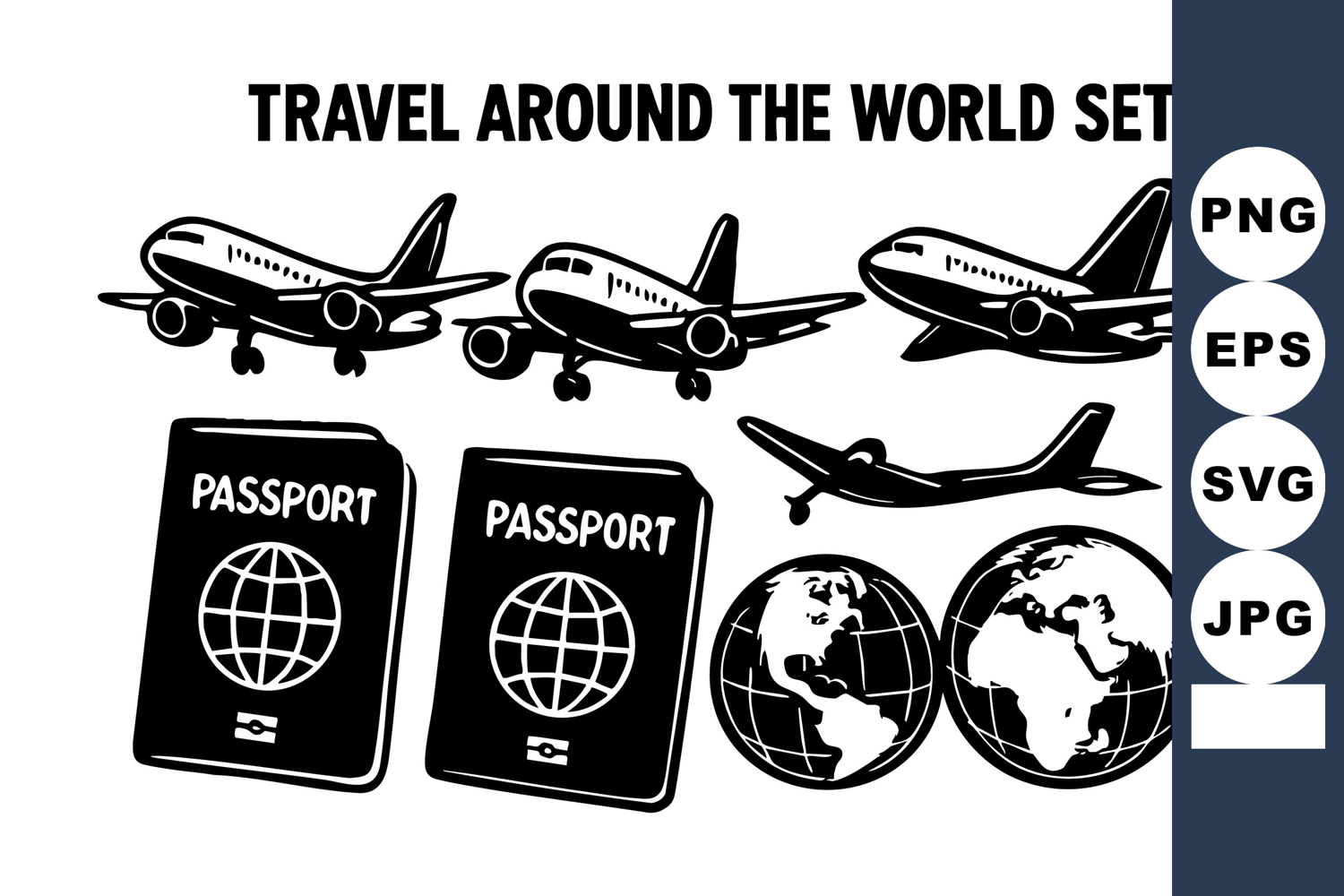 This vector features airplanes, passports, and globes representing global travel and adventure in black silhouette style, conveying exploration and wanderlust in a minimalist design. Calm and inspiring.