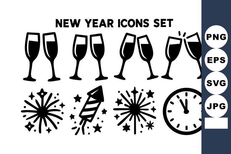 New Year icons with champagne glasses fireworks clock celeb example image 1