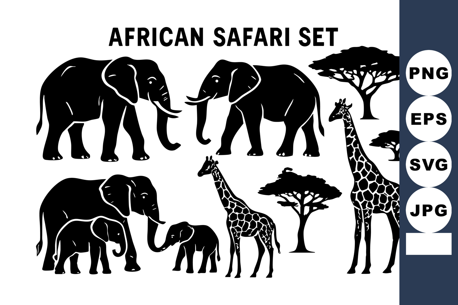 This vector illustration features African safari animals including elephants and giraffes alongside acacia trees in black silhouette style. The wildlife scene evokes a natural and adventurous mood.