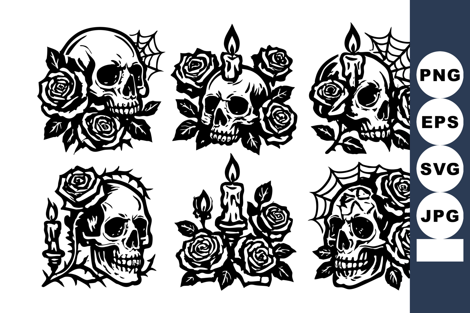 This vector shows gothic-style skulls adorned with roses, candles, and spider webs in black and white, creating a dark and mysterious mood.