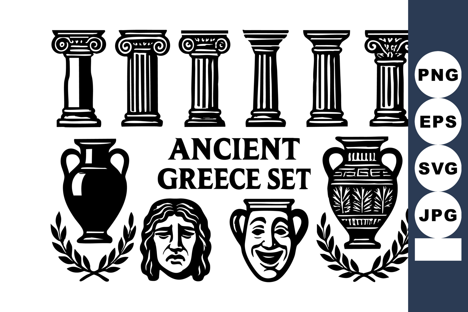 Vector illustration of ancient Greece featuring classical columns, decorative vases, theatrical masks, and laurel wreaths in black silhouette style, evoking historical and cultural significance, timeless mood.