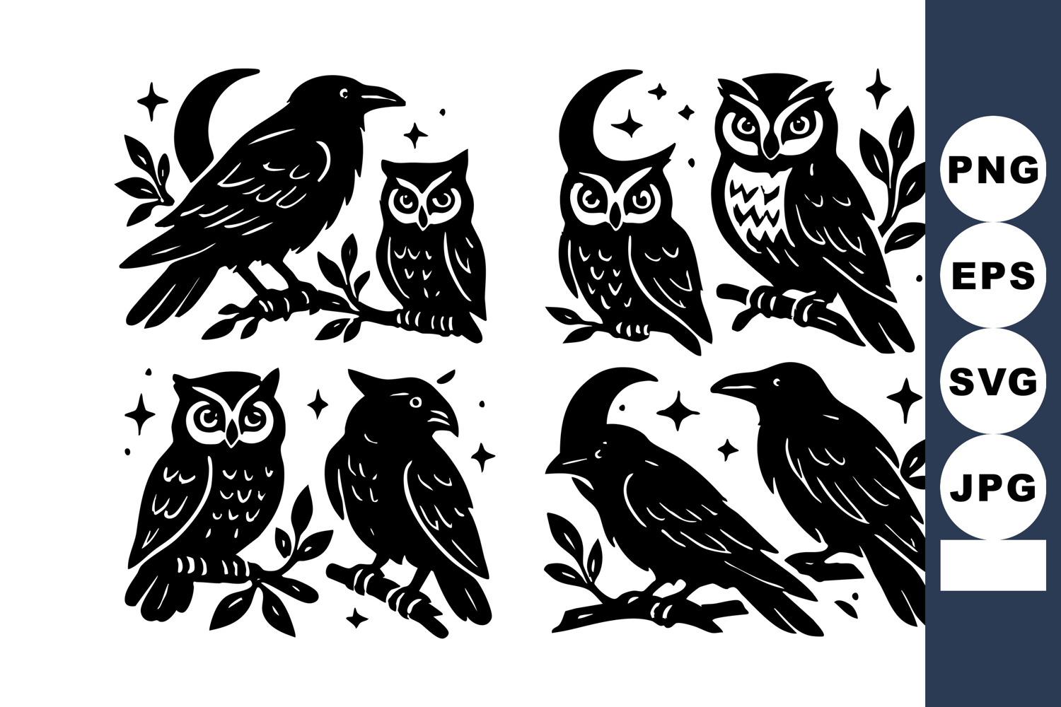 This vector features black silhouettes of owls and crows perched on branches with crescent moons and stars, creating a mystical night theme. The design is simple and striking, evoking mystery and calm.