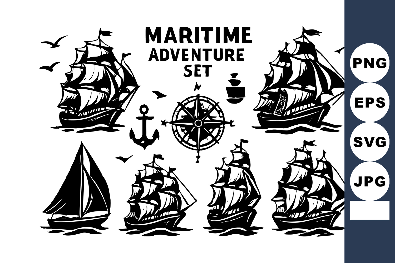 Vector collection featuring vintage sailing ships, compass, anchor, and birds in black silhouette style. Classic maritime adventure theme suitable for nautical design projects. Timeless and adventurous mood.