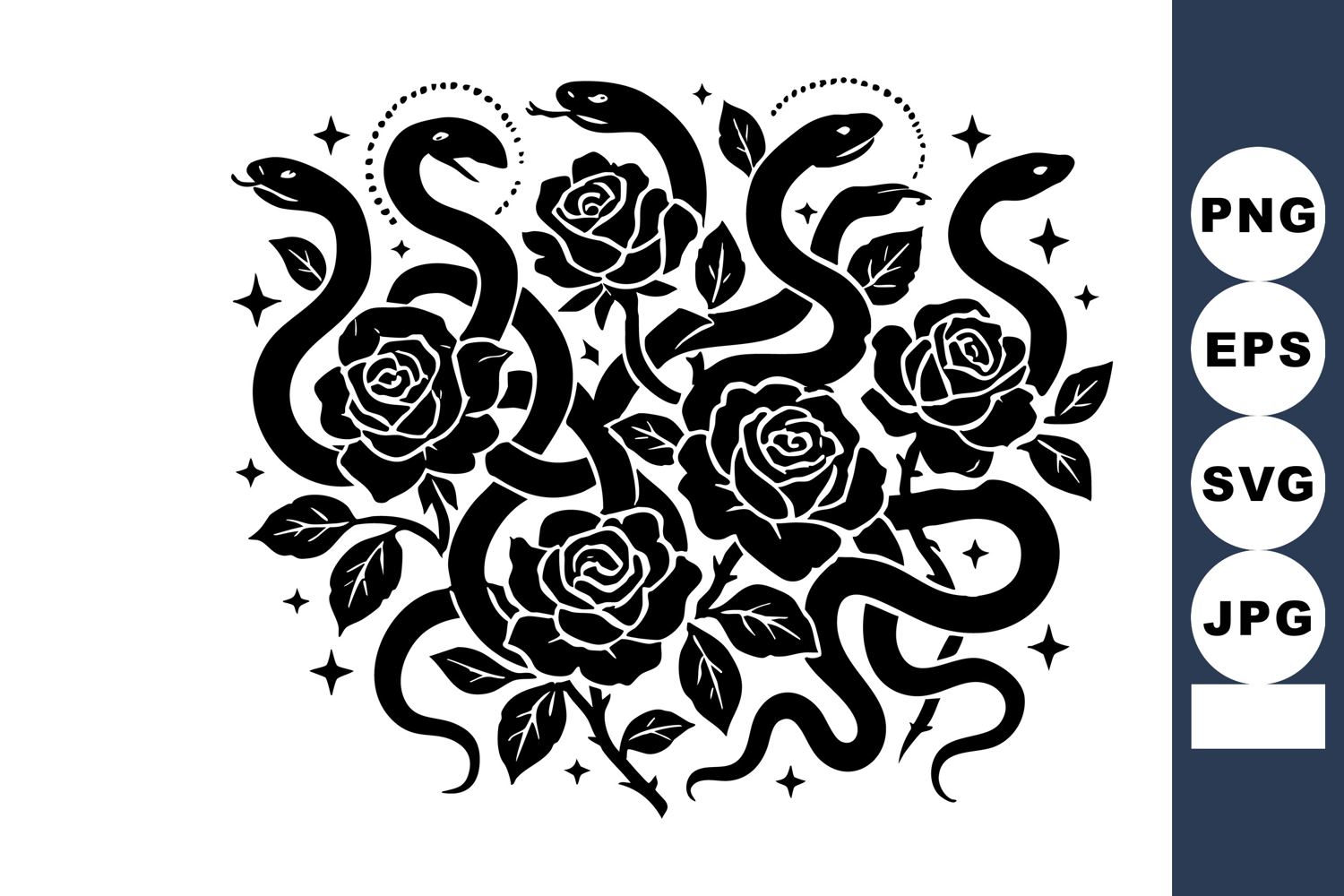 This vector shows black snakes winding through blooming roses and leaves in an intricate decorative pattern, creating a bold and elegant composition. Mysterious and captivating.