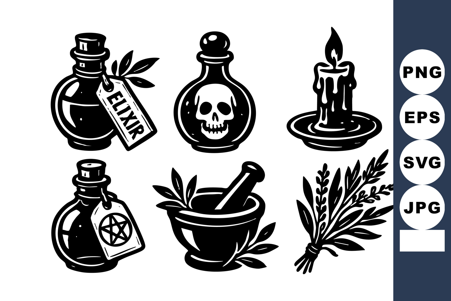 Collection of magic potion bottles featuring elixir, skull symbol, candle, mortar and pestle, and herbs in black and white vector style, evoking mystical and witchcraft themes with a dark mysterious mood.