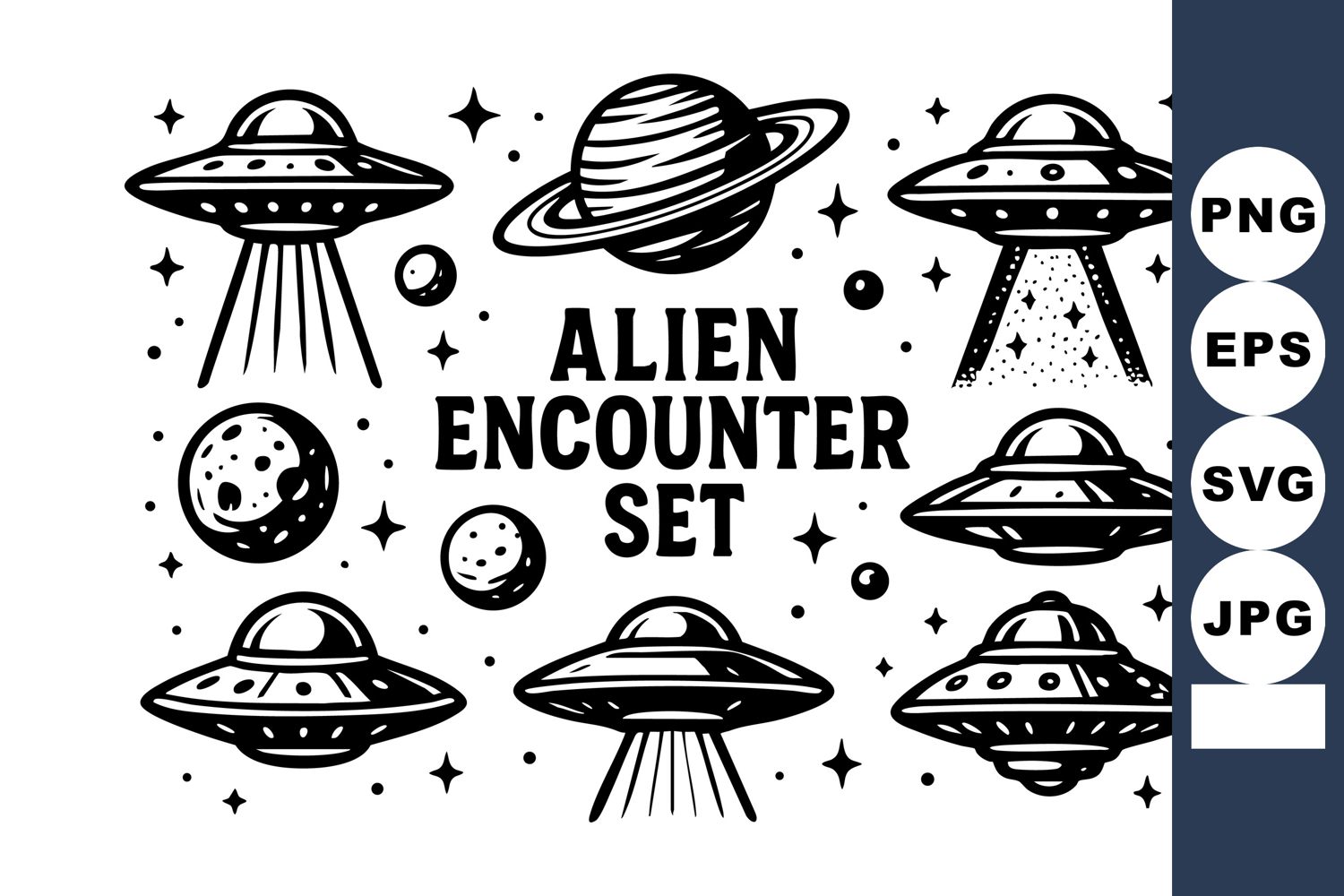 This vector features black and white flying saucers, planets, moons, and stars symbolizing alien encounters in a vintage style. The design is simple and mysterious, evoking curiosity.