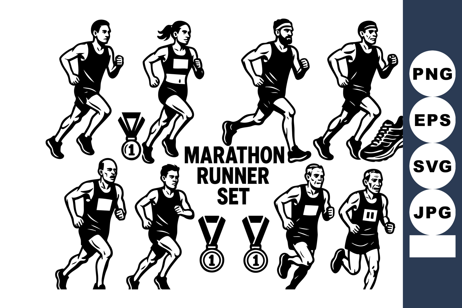 This vector features a of marathon runners including both men and women in various jogging poses alongside running shoes and medals, depicted in a bold black and white style, energetic mood.