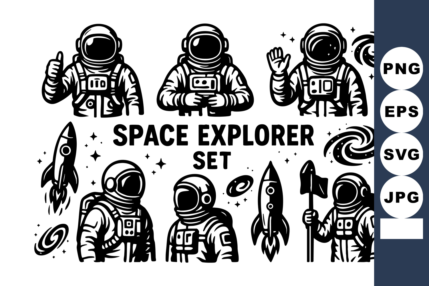 This vector shows space explorers in astronaut suits with rockets, galaxies, and cosmic elements in black and white style, conveying adventure and exploration mood.