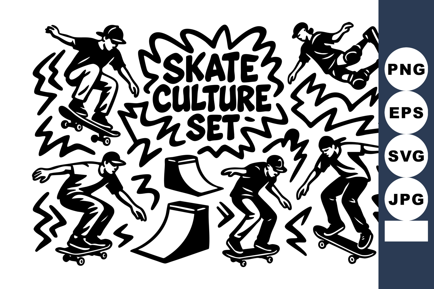 Black and white vector illustration shows skateboarders performing tricks around text skate culture with dynamic lines and ramps, conveying energetic and urban lifestyle mood.