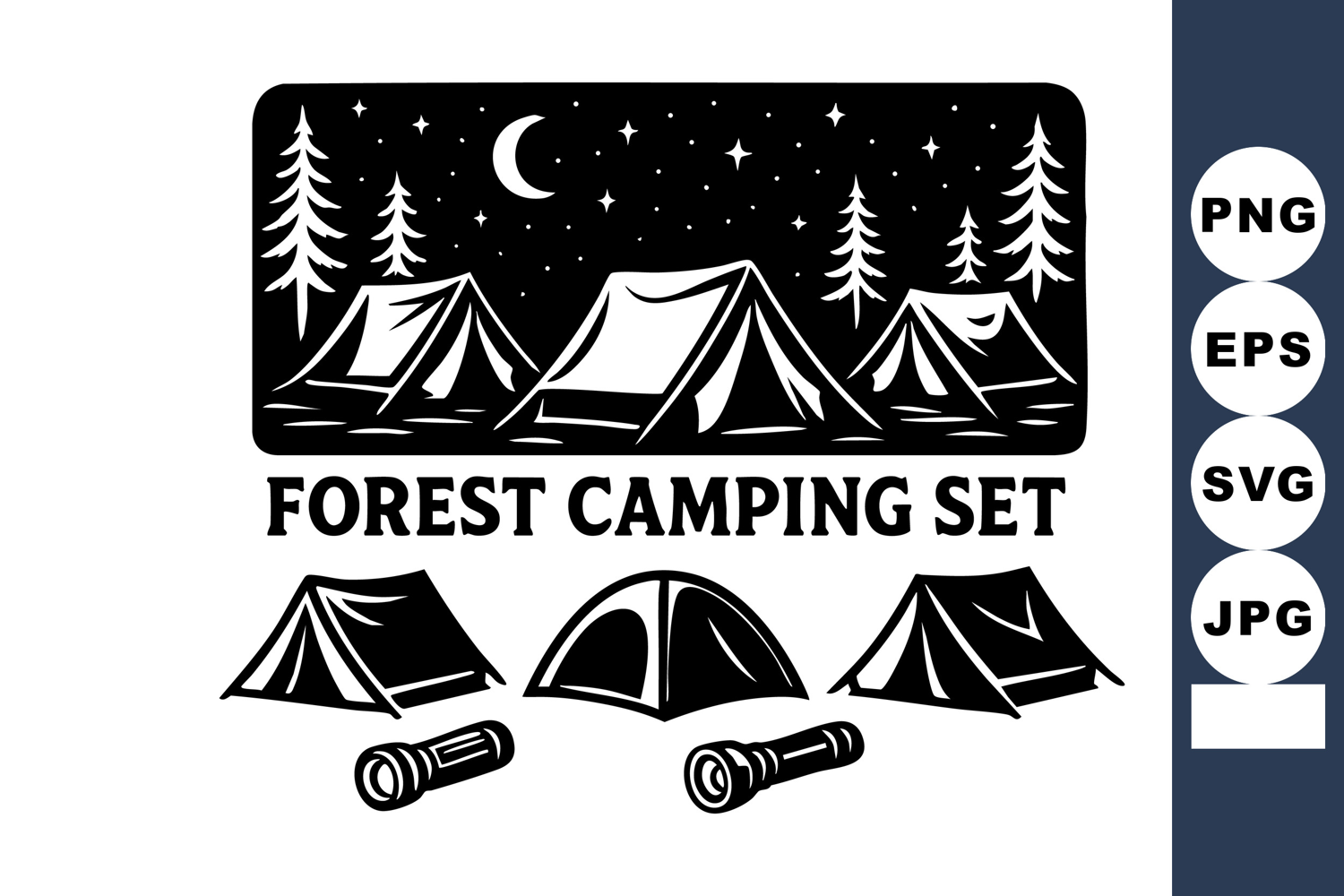 Black and white vector shows forest camping with three tents under crescent moon and starry night sky surrounded by pine trees with two flashlights. calm and adventurous mood.