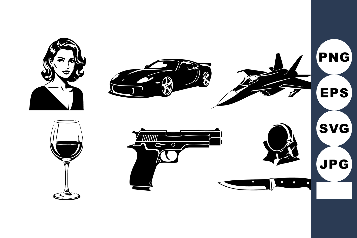 This vector file shows a woman silhouette, sports car, fighter jet, wine glass, handgun, spotlight, and knife in black and white, creating a bold and dynamic visual . Stylish.