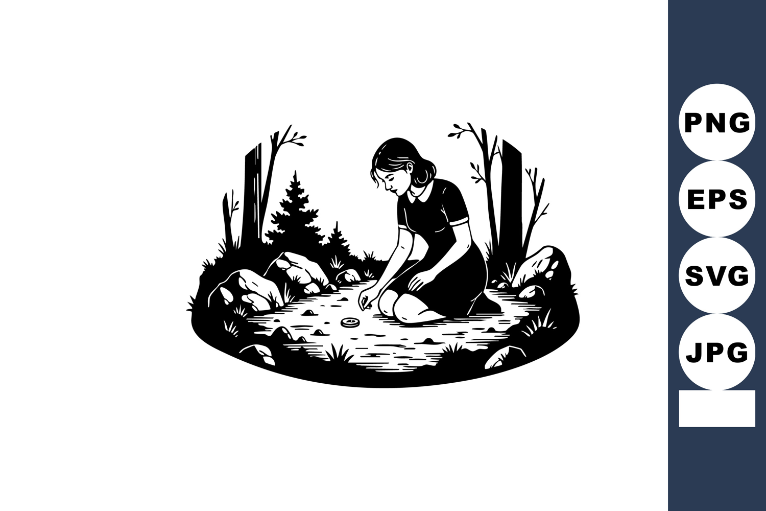 This vector shows a girl sitting by a pond surrounded by trees and rocks in a forest ting, rendered in black and white for a calm and peaceful mood.