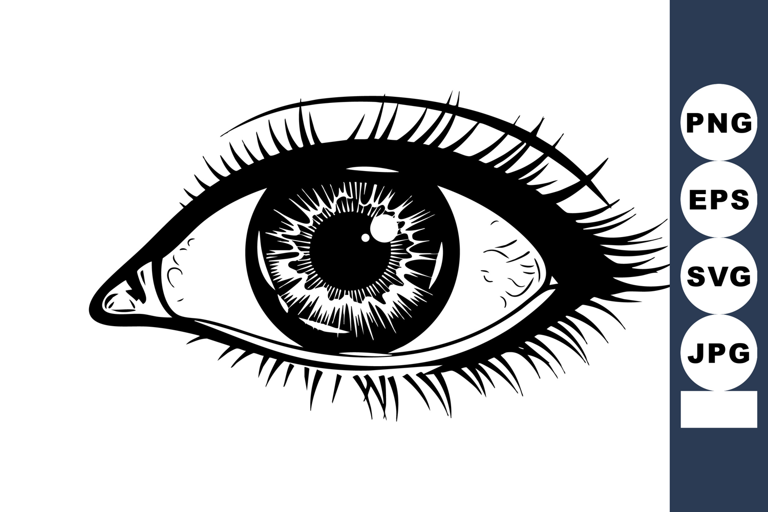 This vector showcases a detailed human eye in black and white with realistic eyelashes and iris patterns in a clean artistic style. The design is sharp and clear, visually striking.