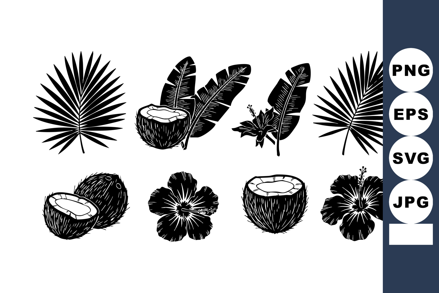 This vector includes tropical palm leaves, coconuts, and hibiscus flowers in black and white, perfect for summer-themed design projects and decoration. Bright and fresh mood.
