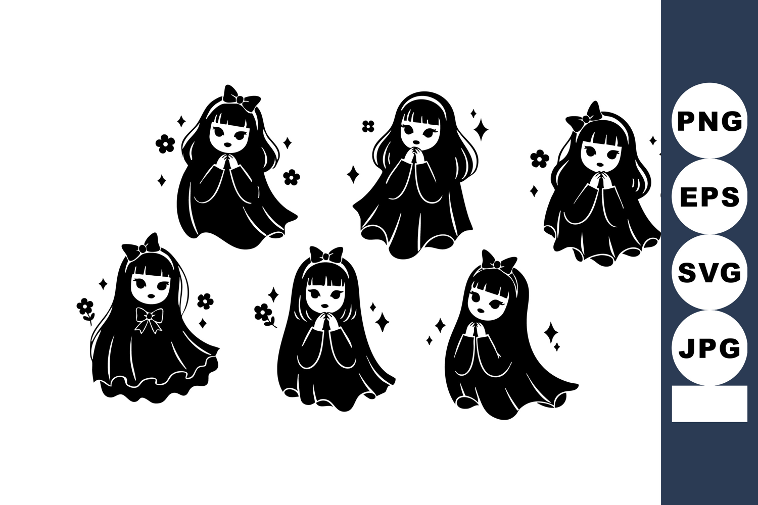 This vector shows six adorable little girls wearing black cloaks with bows and surrounded by flowers and sparkles. The style is playful and whimsical with a magical theme, charming mood.
