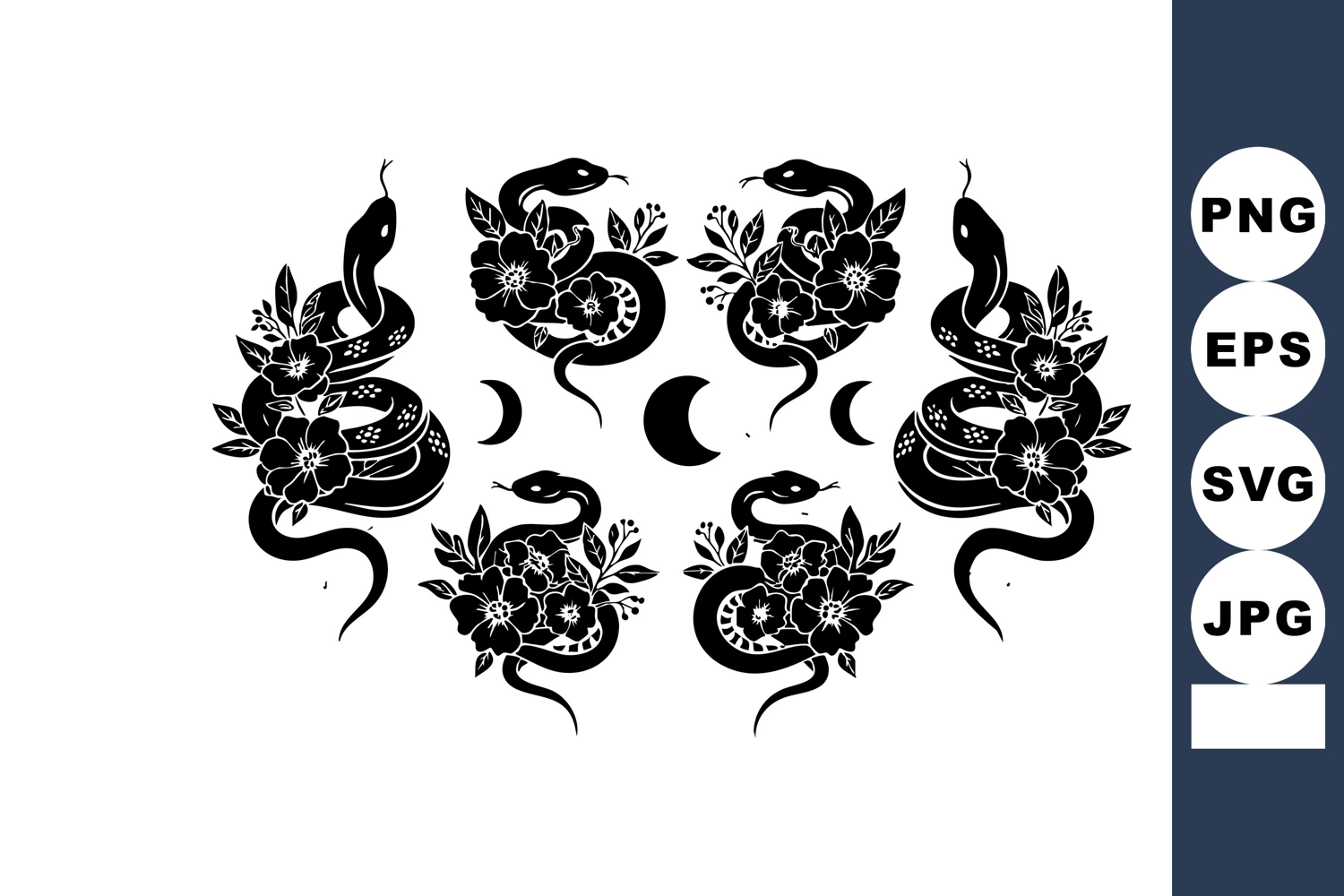 This vector art features black and white snake motifs intertwined with floral elements and moon phases, creating a mystical and balanced composition with a gothic feel.