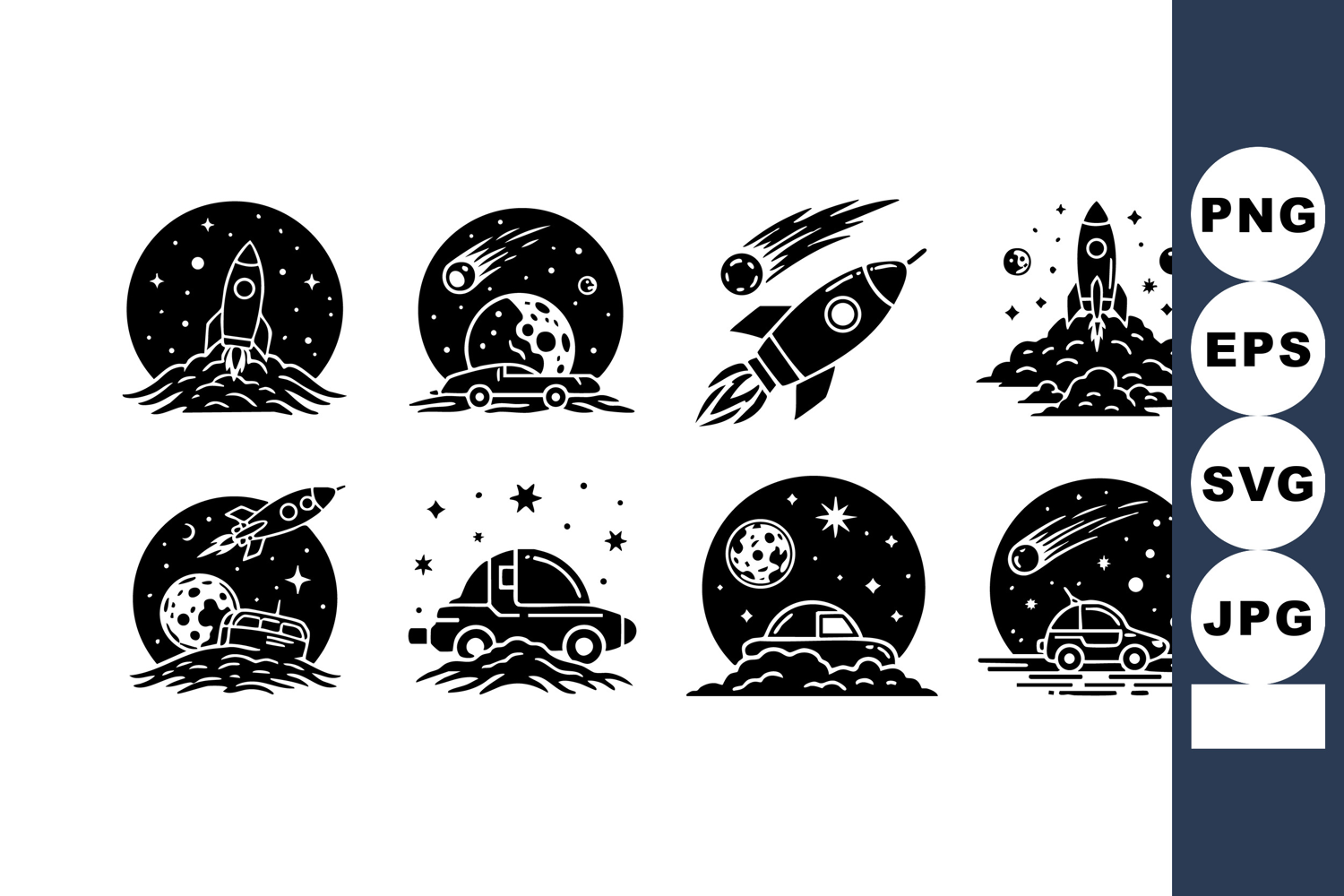This vector showcases black and white space exploration icons featuring rockets, moons, stars, planets, and futuristic rovers. The style is bold and minimalistic, conveying adventure and discovery.