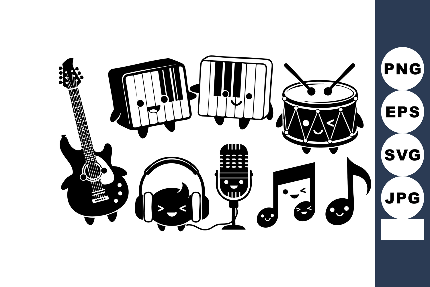 This vector features charming musical instruments and notes with smiling cartoon faces, including guitar, piano, drum, microphone, and headphones, conveying a joyful and playful mood.