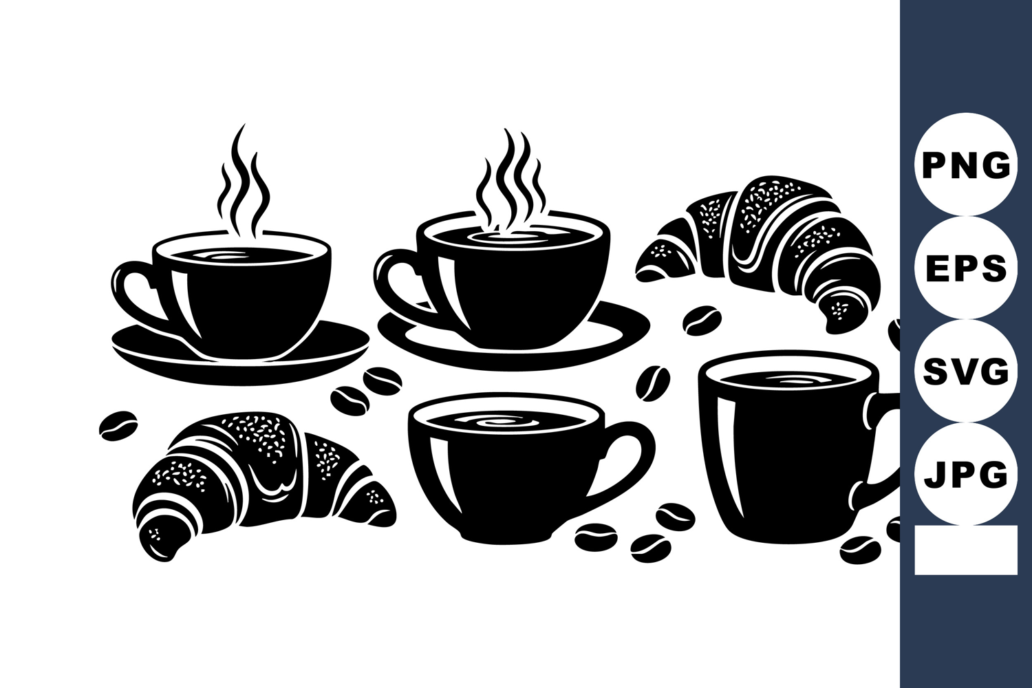 This vector features black and white steaming coffee cups alongside croissants and scattered coffee beans in a minimalist style, evoking a cozy morning mood.
