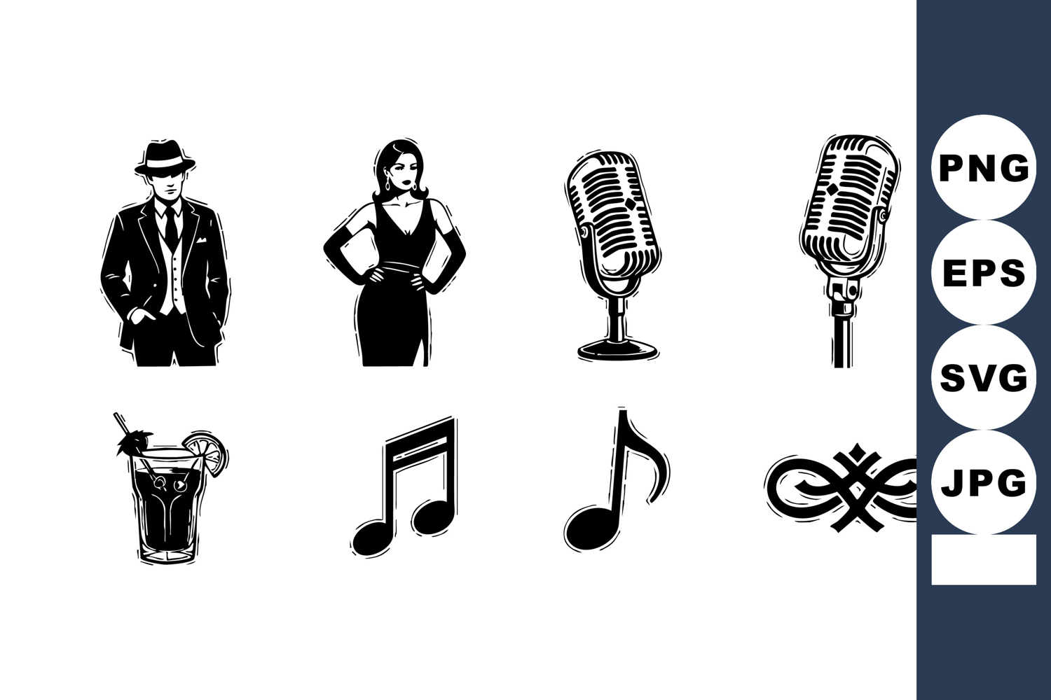 Vector design shows retro blues singers with vintage microphones, cocktail drink, music notes, and ornamental symbol in black and white style. Classic and artistic mood.