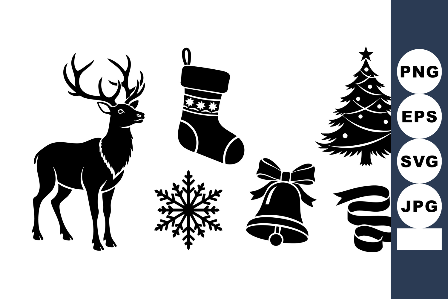 This vector showcases classic Christmas icons including a reindeer, stocking, decorated tree, snowflake, bell, and ribbon in black silhouette style, evoking festive holiday spirit. Cheerful.