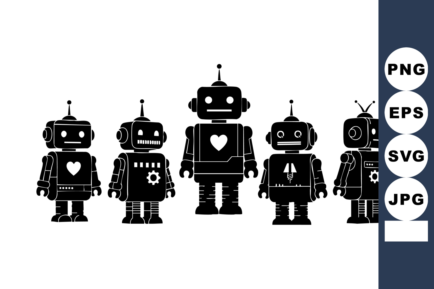 This vector features five black robot silhouettes with heart and gear icons, symbolizing technology and emotions in robotics. The design is clean and modern, conveying innovation and creativity.