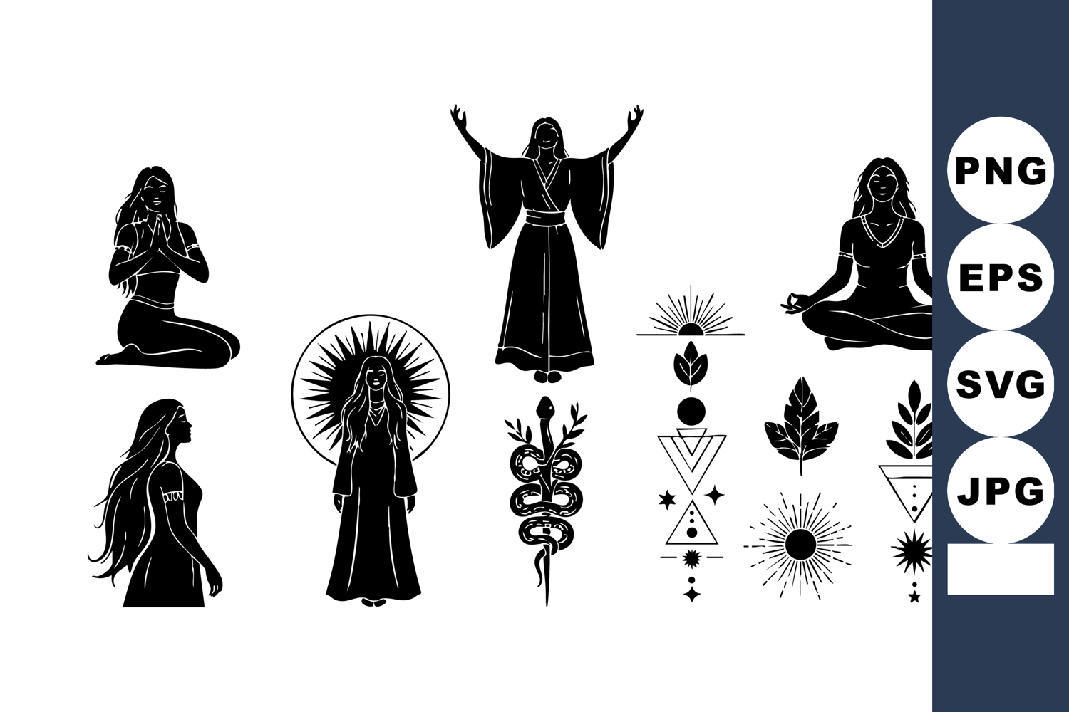 This vector features black silhouettes of women in meditation and prayer poses alongside spiritual and mystical symbols, creating a calm and introspective atmosphere. Serene mood.