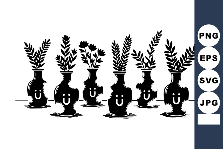 This vector features six black jars aligned in a row, each holding different leafy and floral branches. The black and white style gives a vintage and elegant mood.