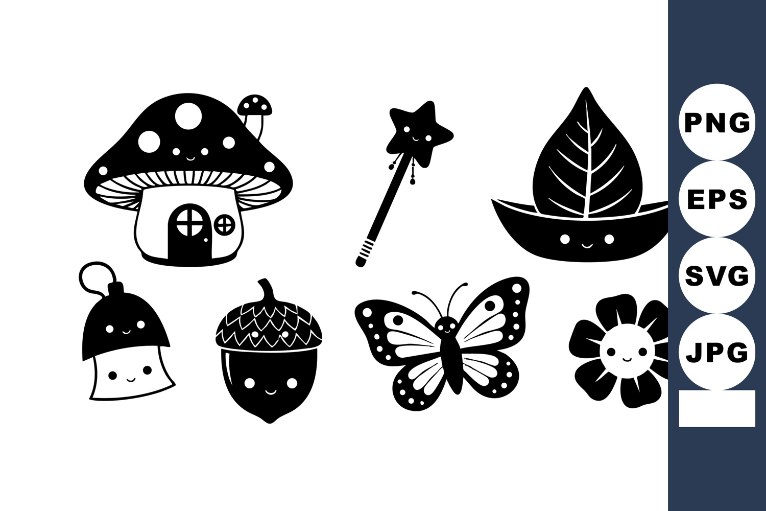 This vector shows a whimsical mushroom house, fairy wand, acorn, butterfly, leaf boat, and smiling flower in black silhouette style, evoking fantasy and nature themes. Charming and playful.