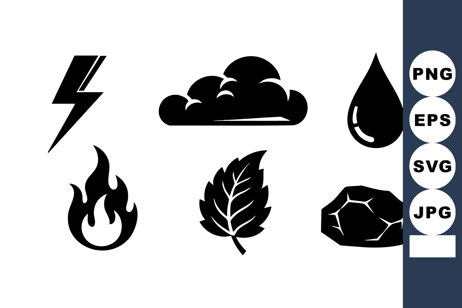 This vector illustration displays six natural element icons representing lightning, cloud, water, fire, leaf, and rock in a simple black silhouette style for versatile design applications. Clean and minimal.