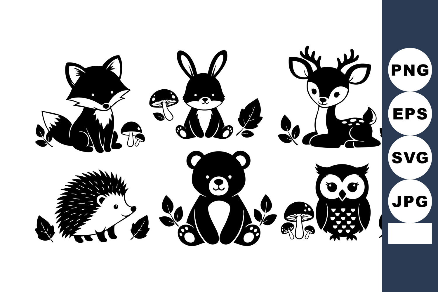 This vector features adorable black and white forest animals such as fox, rabbit, deer, hedgehog, bear, and owl with mushrooms and leaves, creating a charming woodland scene. Cheerful.
