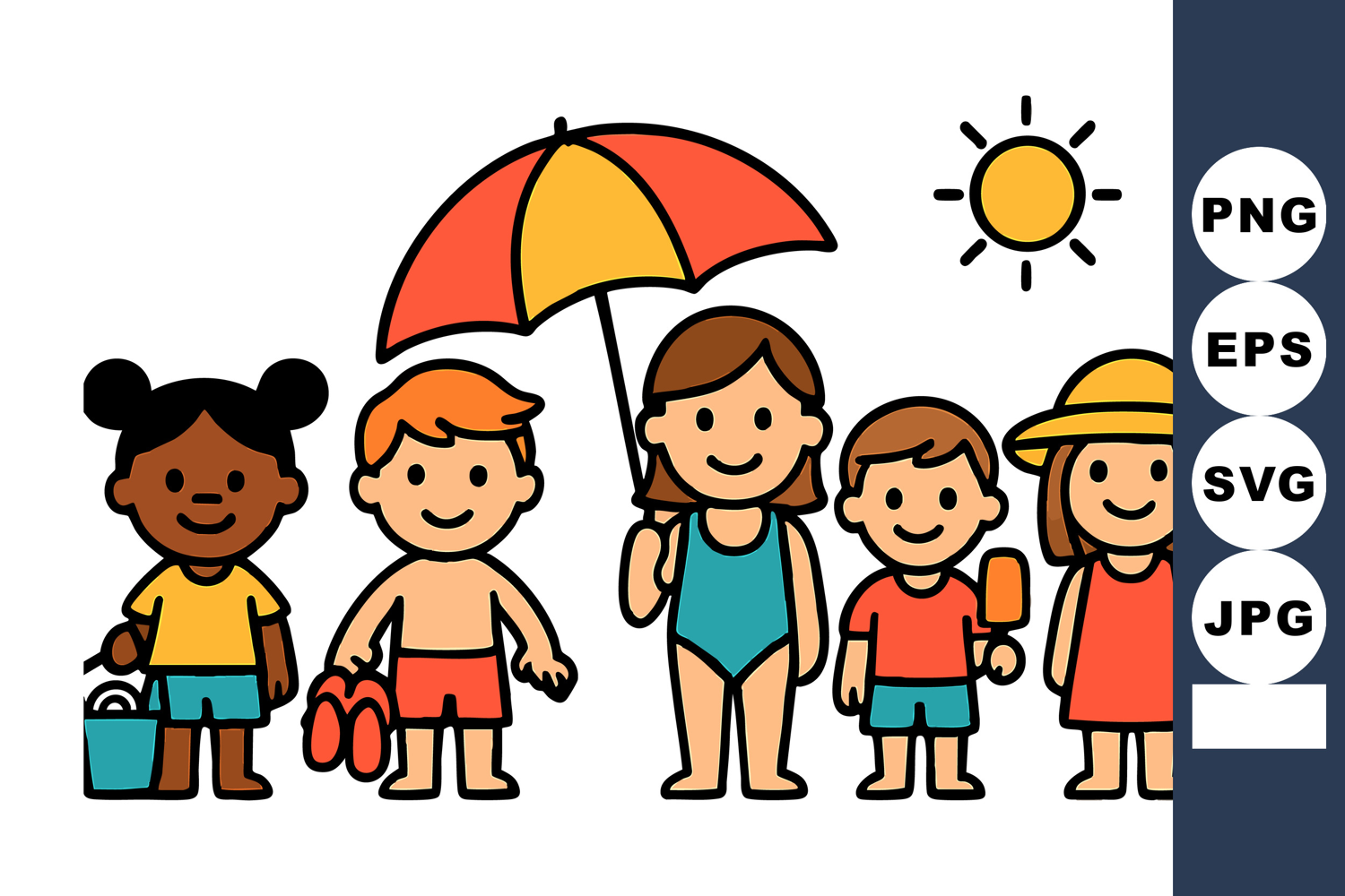 Five children stand smiling on a sunny beach day wearing swimsuits and summer hats, holding ice cream and beach toys, creating a cheerful and bright mood.