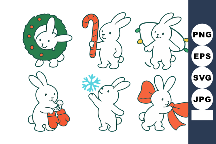 This vector features six cute white rabbits holding Christmas wreath, candy cane, string lights, stockings, snowflake, and a bow in a festive holiday ting. Cheerful mood.