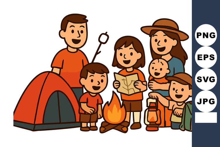 Family enjoys camping together with children exploring a map, sitting by a campfire near a tent, using a lantern in the outdoor environment. Scene is cheerful and warm.