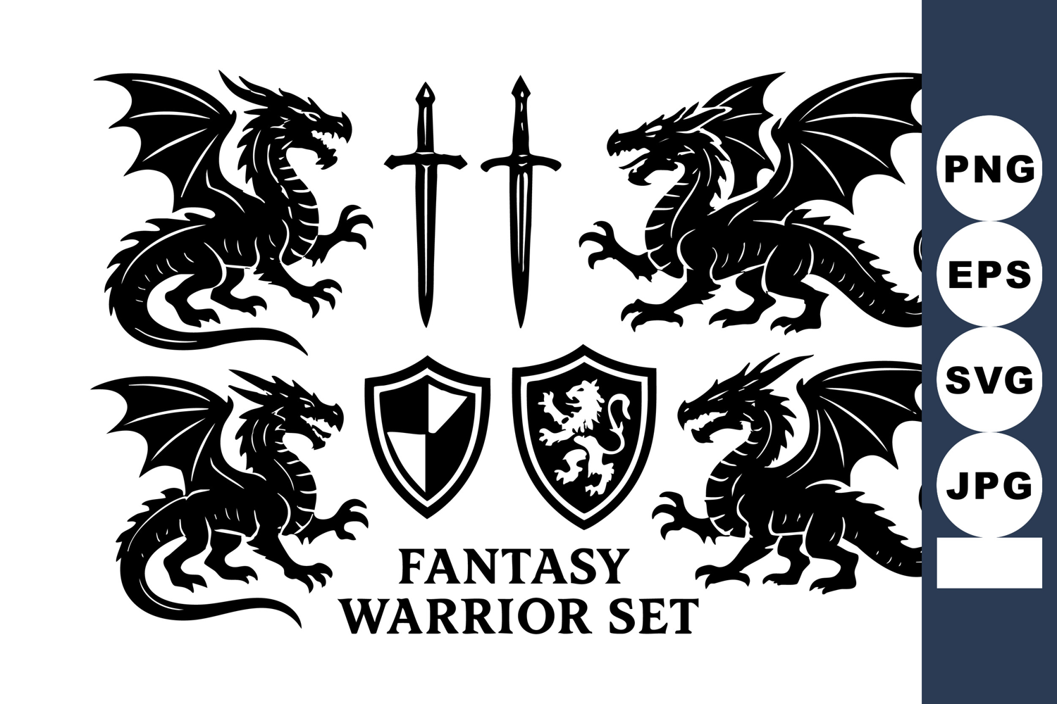 This vector features fierce dragons, crossed swords, and heraldic shields in black silhouette, perfect for fantasy and medieval themes, evoking a bold and mythical atmosphere.