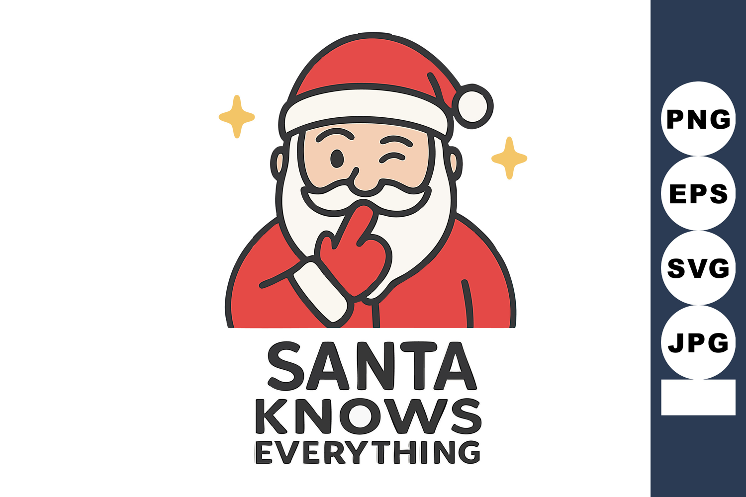 Vector cartoon of Santa Claus winking and holding finger to lips, symbolizing secrecy or knowledge for Christmas. Bright colors and festive mood create a joyful holiday atmosphere. Cheerful.