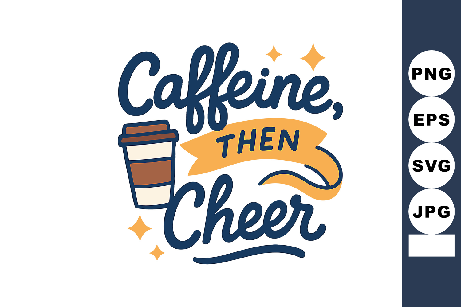 This vector design features a coffee cup and motivational quote Caffeine, Then Cheer in blue and orange colors, inspiring energy and positivity. Cheerful vibe.