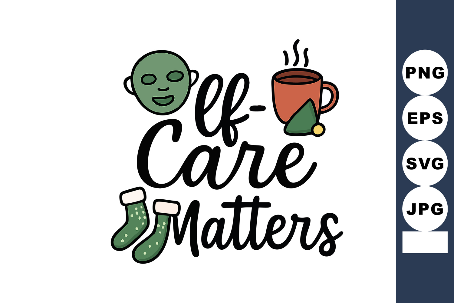 This vector design shows the phrase Self care matters with a green facial mask, cozy socks, and a steaming coffee cup, promoting wellness and relaxation in a cheerful mood.