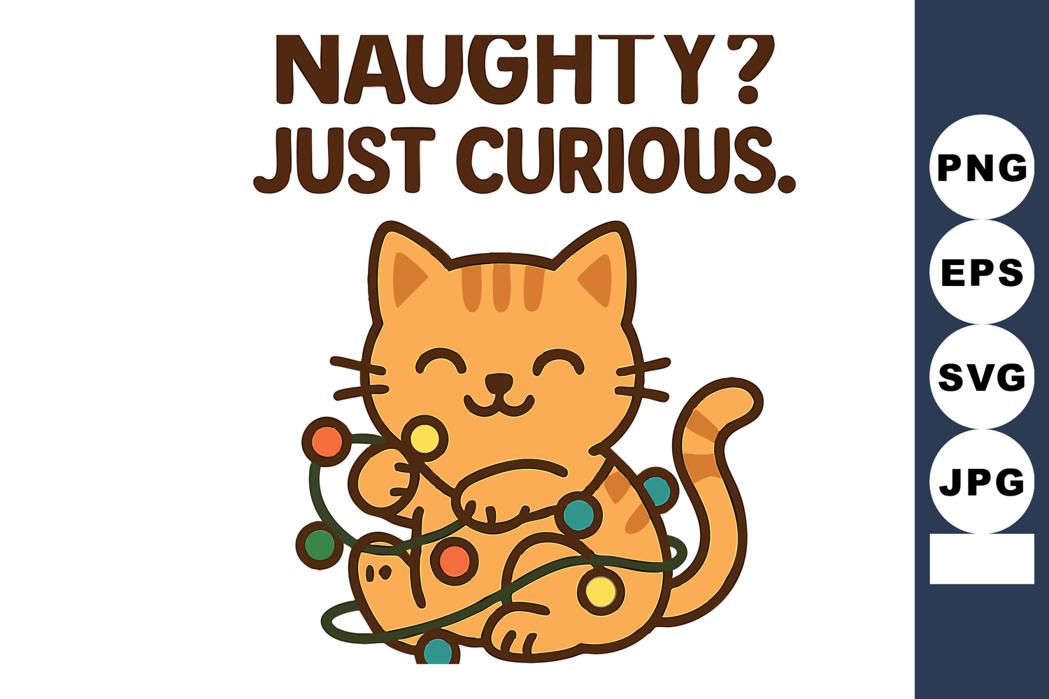 This vector shows a happy orange tabby cat playfully tangled in colorful string lights with the words naughty just curious above in brown. The mood is cheerful and playful.