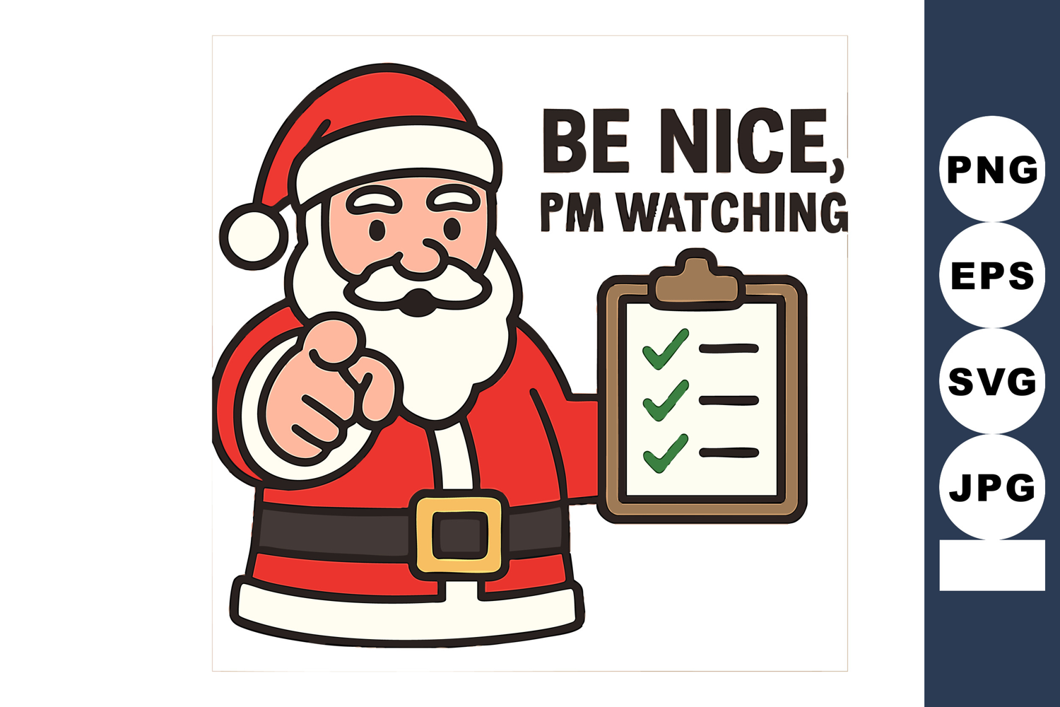 Santa Claus points forward with a checklist clipboard reminding to be nice during Christmas holiday in festive red and white attire, creating a playful and cheerful mood.