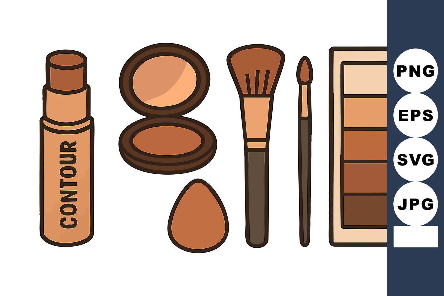 Vector illustration shows contour makeup products including stick, powder compact, brushes, and palette in brown tones for face makeup and beauty routines, bright and clear style. Calm mood.
